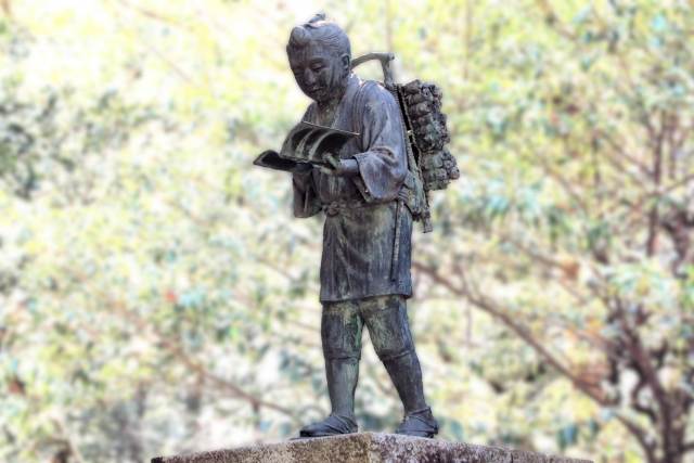 二宮尊徳は薪を背負いながら本を読む姿で知られ、勤勉の象徴として多くの人々に親しまれています。