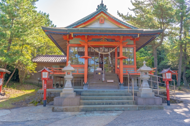 月讀尊、月讀尊荒御魂、伊邪那岐尊、伊邪那美尊を祀る四つの社殿が並び、農業豊穣、航海安全、家内安全、縁結び、安産子育てなど様々なご利益があります。